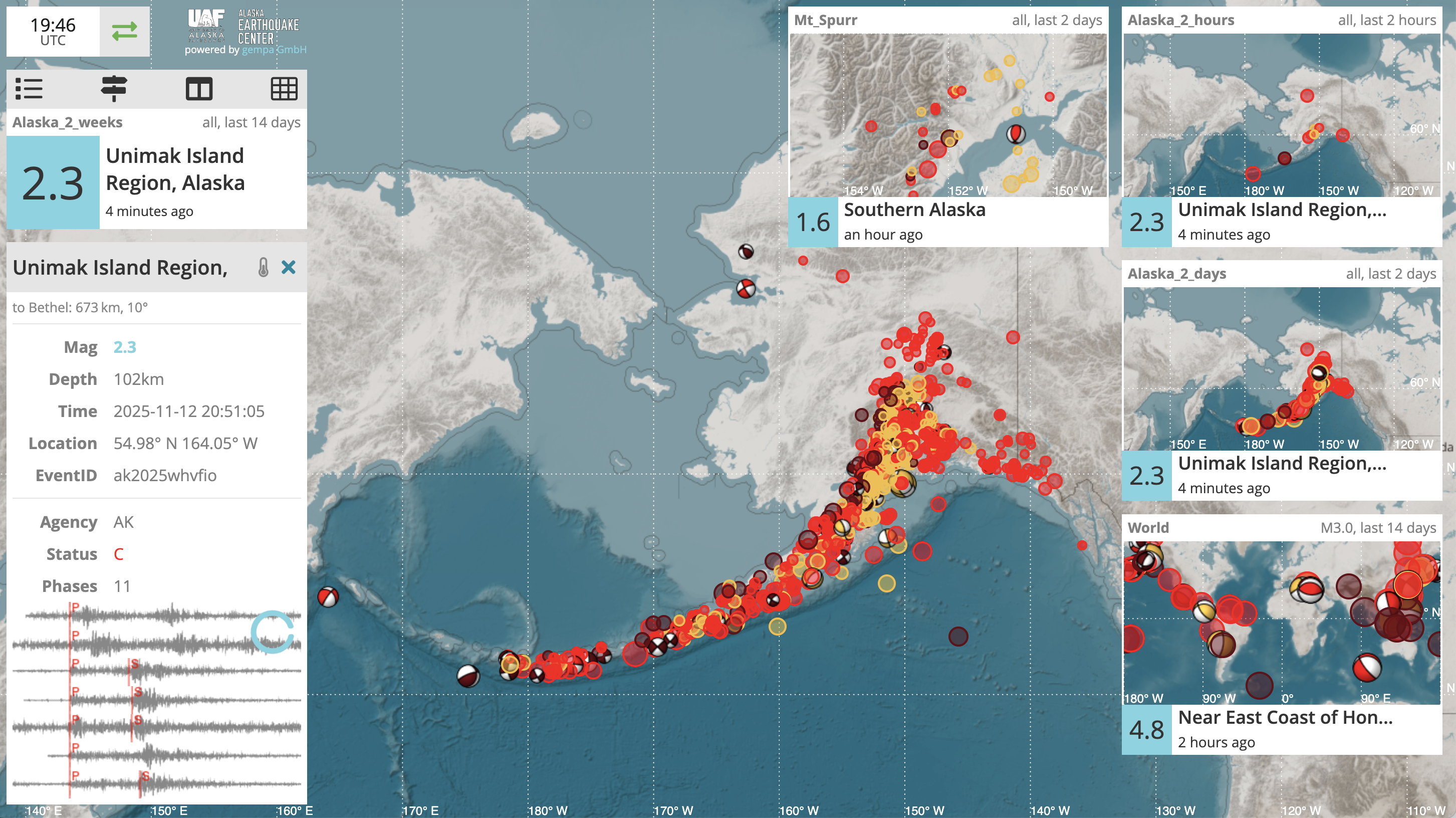 You’ll notice a new look to maps and graphs that support our science stories (Figure 2), for example in our October 2025 coverage of a widely felt earthquake in the Kenai Peninsula. If you come visit us in Fairbanks, at the Geophysical Institute, we can show off our new command center (Figure 3). Most importantly, we are now poised atop a stronger foundation to rapidly assess and share seismic information, and we look forward to sharing the new capabilities as we implement them in the future.