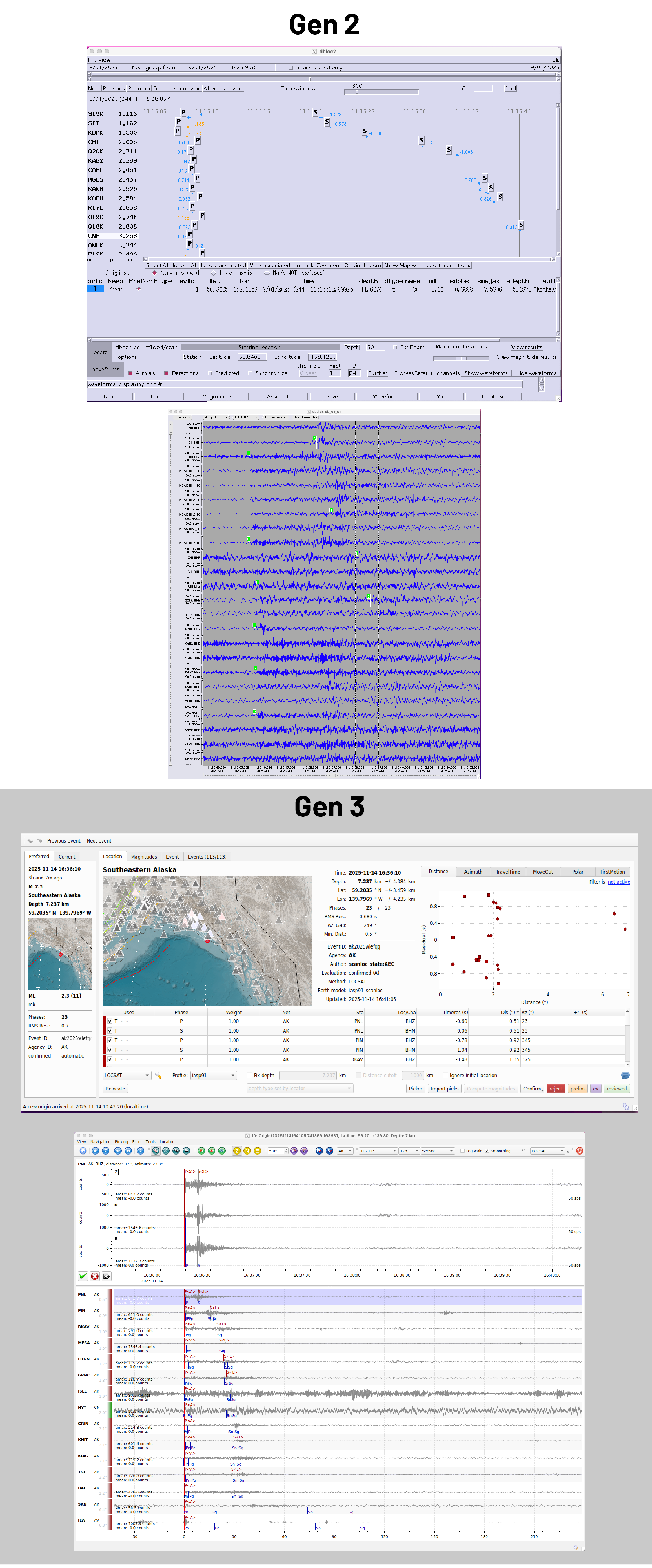 This isn’t the first time that we’ve upgraded our system for analyzing seismic information. In the 1970s, the workflow involved heat-sensitive paper, a dark room, microfilm, rulers, and staff that voluntarily came to the office if there was an earthquake outside of work hours. The leap to digital marked a fairly conspicuous turning point, what we refer to as our “Gen 1” digital seismic toolkit. The first use of dedicated analytical software brought us to “Gen 2” alongside a rapid increase in the number of seismic stations.