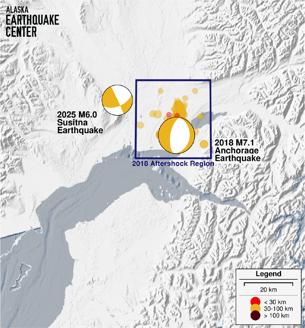 Comparison of the 2018 M7.1 mainshock aftershock sequence with today’s M6.0 Susitna sequence. The Susitna earthquake lies outside of the 2018 aftershock zone, and its focal mechanism indicates a different faulting style. (Credit: Sarah Noel)