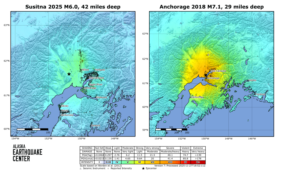 Side-by-side comparison of the Susitna 2025 and the Anchorage 2018 intensity maps. Intensities for this earthquake are about 2–3 levels lower than the Anchorage earthquake. Despite having a lower magnitude and being almost twice as deep, the event was still widely felt throughout Interior and Southcentral Alaska. In fact, this event received almost three times as many felt reports (small colored dots on the map) about 6500 vs 2300! (Credit: Alex Fozkos)