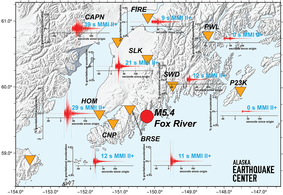 Magnitude 5 and above earthquakes are not unusual in the Kenai Peninsula, which has experienced almost 400 of these in the past 40 years (Figure 5). More than 2,000 people filled out a “Did You Feel It?” viewable on the U.S. Geological Survey's map interface, and conversation about individual experiences played out through the day over the Alaska Earthquake Center social media threads. Most reported that they thought the shaking lasted 10 to 30 seconds, which is verified by the shaking recorded by surrounding seismic sites (Figure 6). How anyone experiences shaking depends on many factors, which we have previously described here.